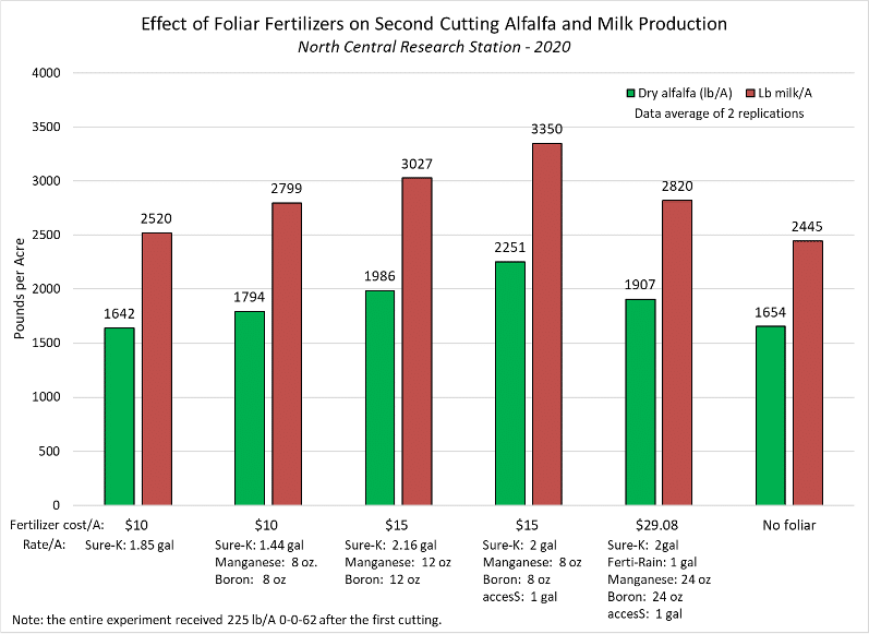 The entire experiment area received a broadcast application of 225 lb/A of 0-0-62 after first cutting. AgroLiquid treatments were designed at $10, $15 and $29 per acre, plus a no-foliar check, based on local retail prices in 2020. Fertilizer treatments were applied to six-inch regrowth after first cutting in fifty foot plots with two replications.