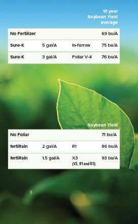 Sure-K and fertiRain can be applied alone, or in combination with each other or other crop nutrients. Soybeans will often require more potassium than fertiRain alone can provide, and fertiRain can provide additional nitrogen, phosphorus, and sulfur to Sure-K.