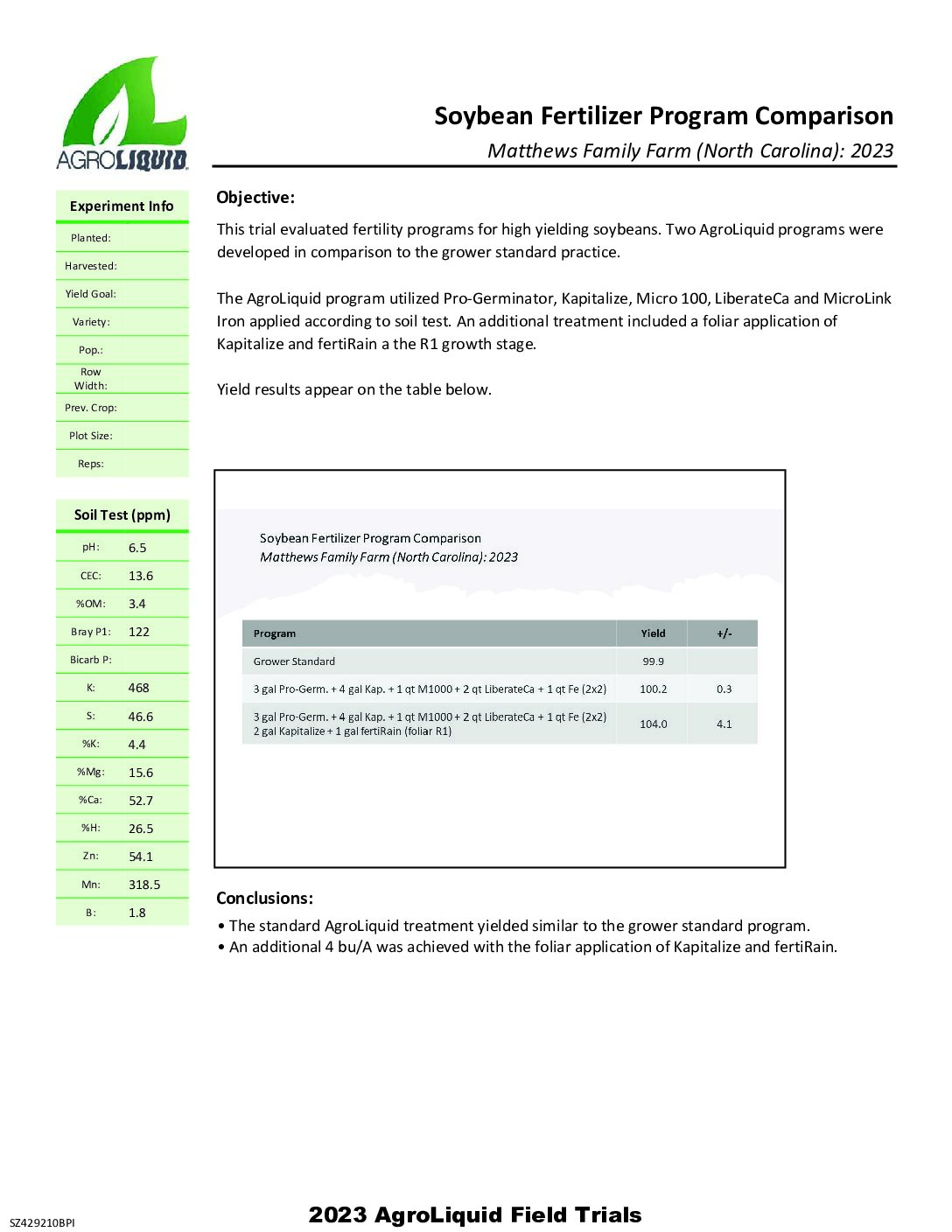 Crops: Corn. States / Provinces: North Carolina. Nutrients: Calcium and Potassium. Years: 2024. Applications: Planter and Planting.Soybean Fertilizer Program Comparison – Xtreme Ag_North Carolina
