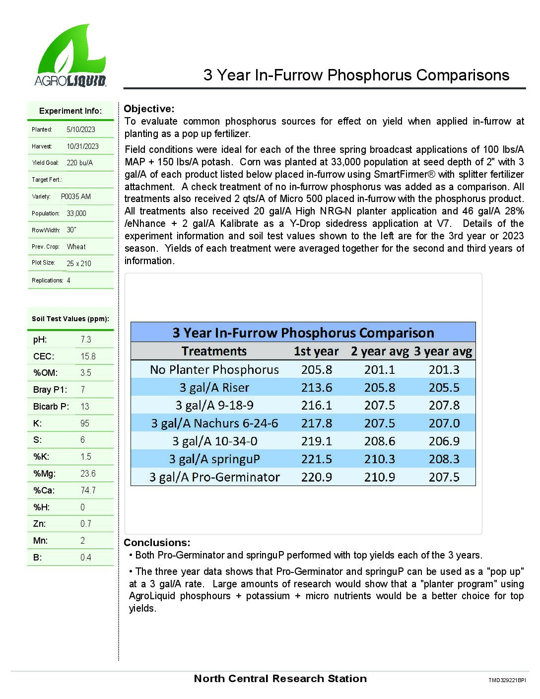 AgroLiquid is consistently looking for new opportunities to fill gaps in the fertilizer market. Phosphorus can be applied in many ways and is needed in both starter and slow-release forms. In this experiment, two experimental products: TDP-19 (a slow-release version) and UP-20 (a starter version), are tested against existing products, ProGerminator and springUP, to determine product efficacy differences.