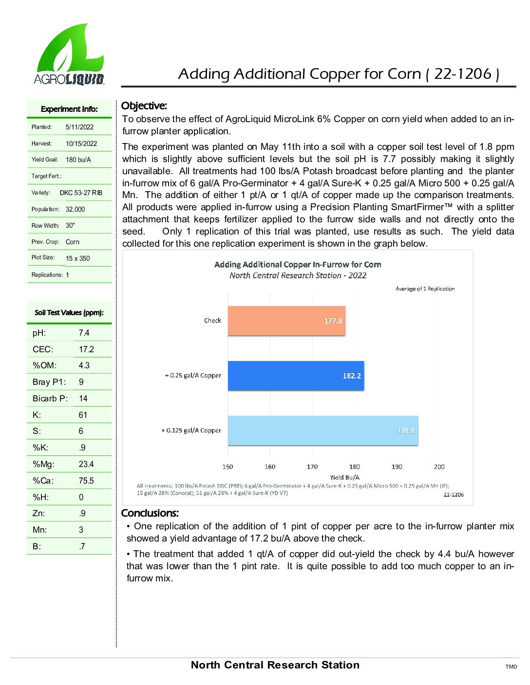Copper is not normally thought of as a nutrient to add to a fertility plan. However, if it is a limiting factor could it help to improve yield?  AgroLiquid MicroLink 6% copper added in-furrow in this one replication test increased corn grain yields.