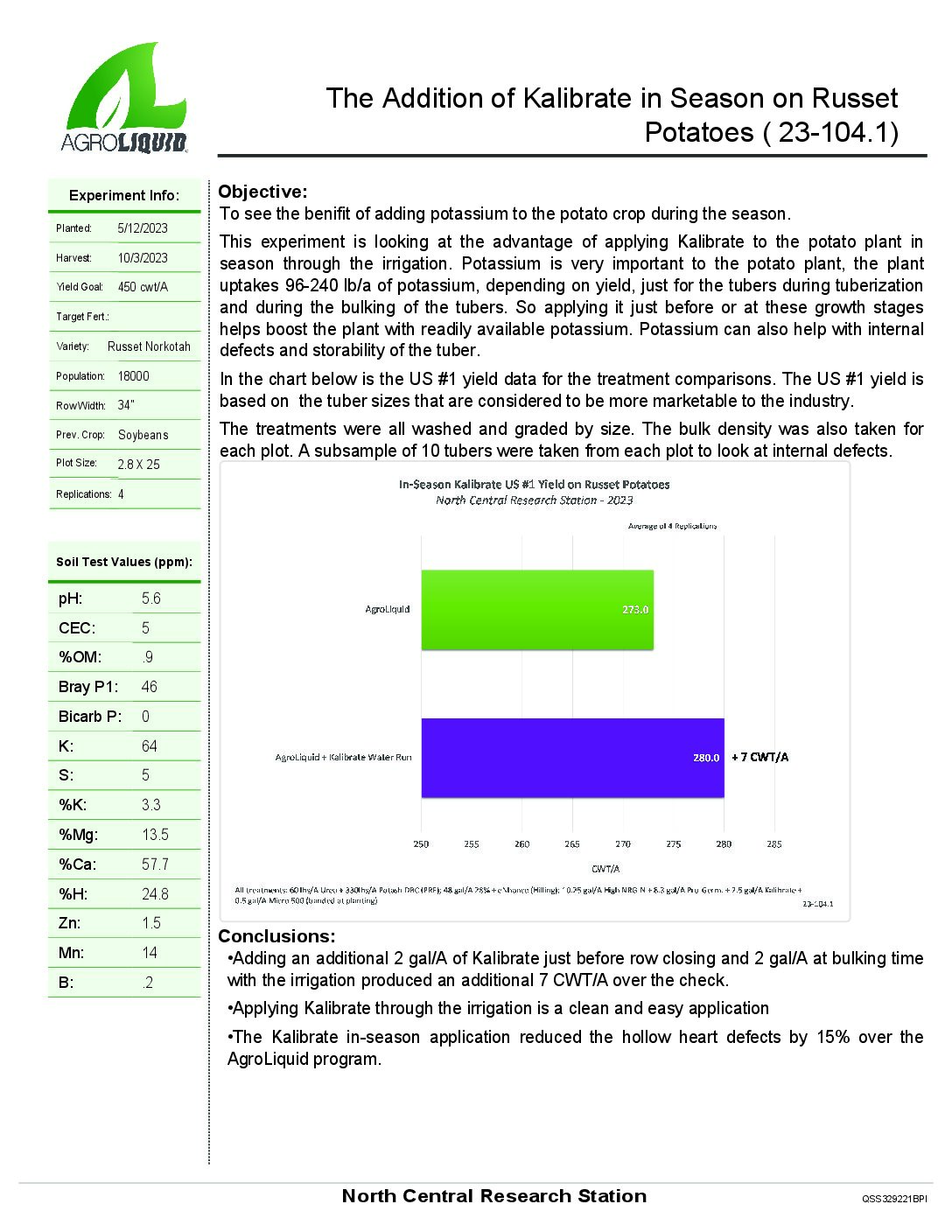 The goal of this experiment was to look at the best rate of Kalibrate to apply on the potato crop and when the best timing of the application would be.