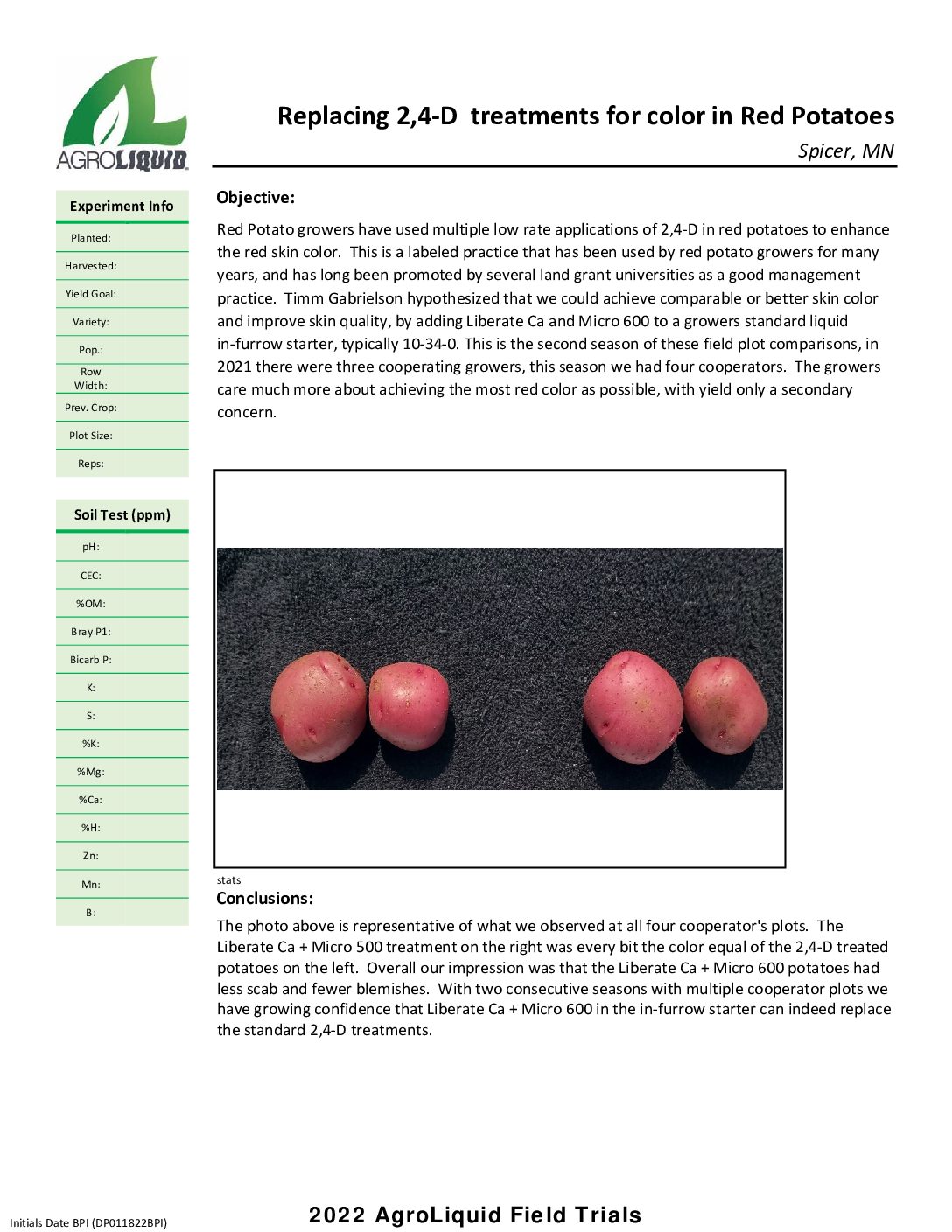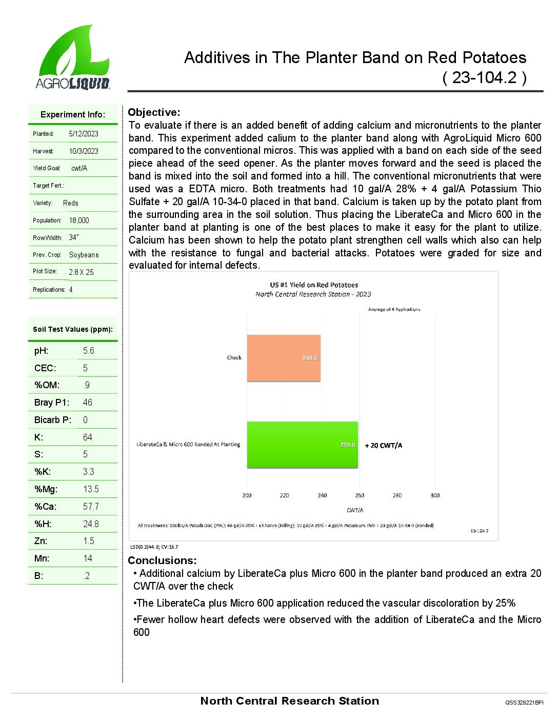 The objective of this trial was to compare the skin color and quality on red potatoes treated with the grower standard of multiple low-rate applications of 2,4-D, versus adding AgroLiquid calcium and micronutrient products in-furrow.