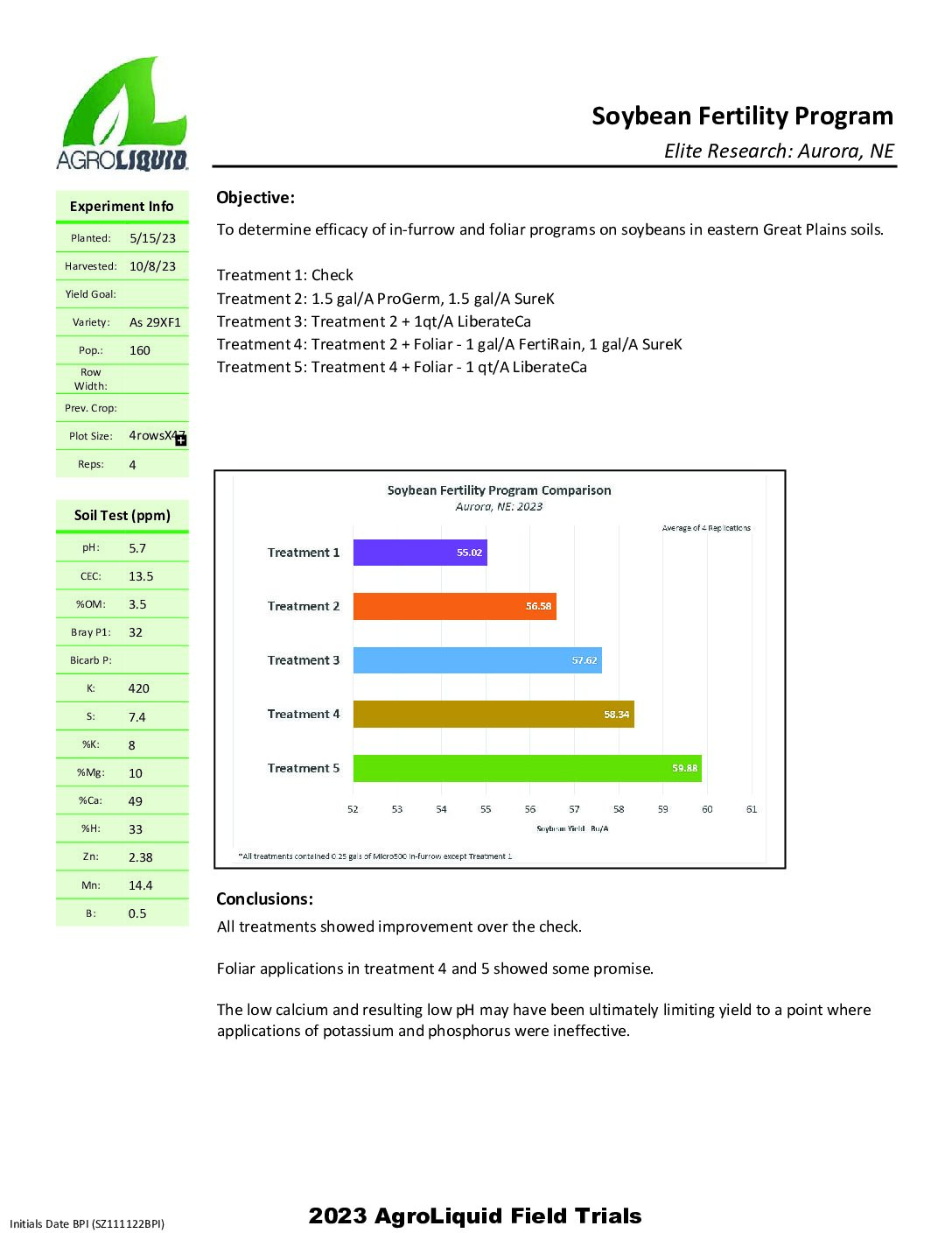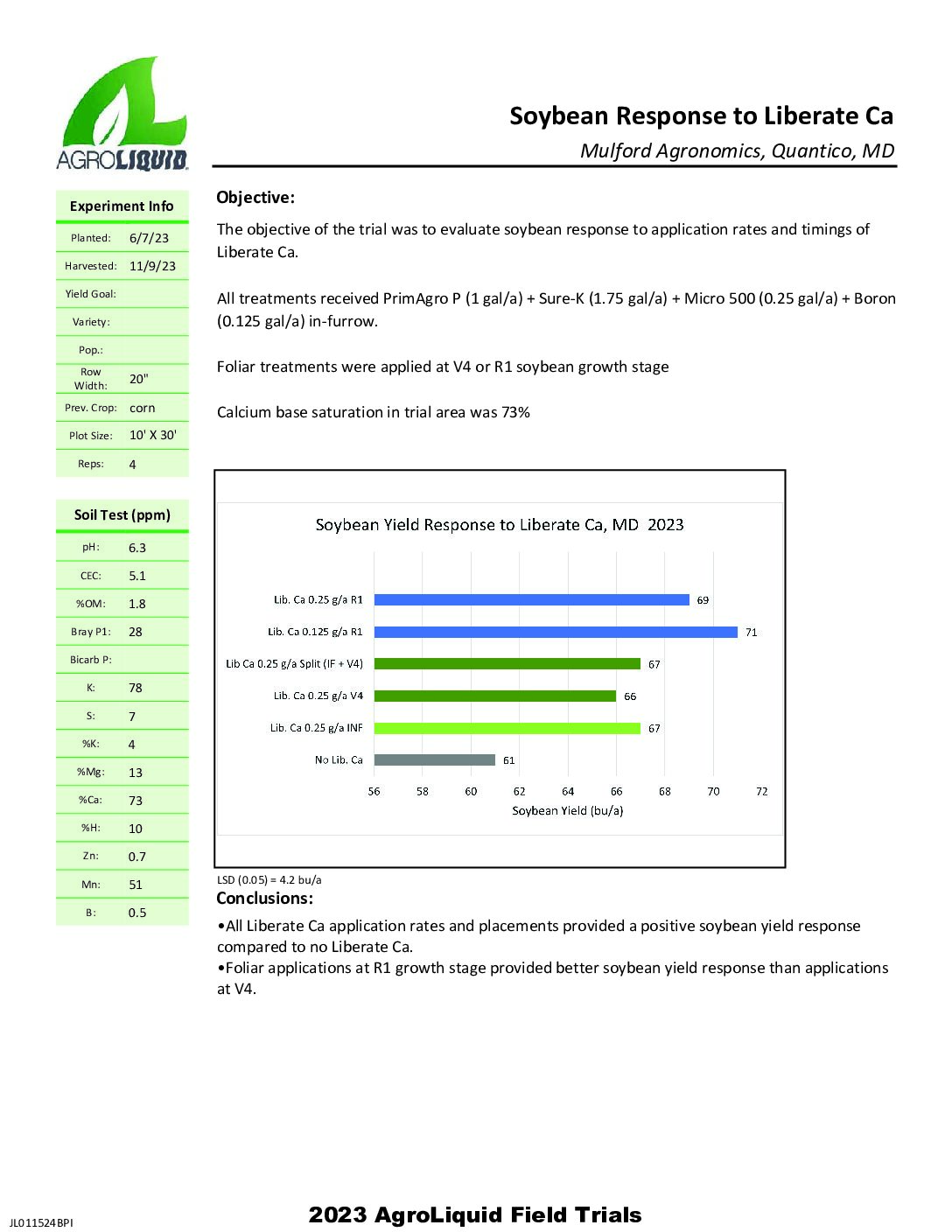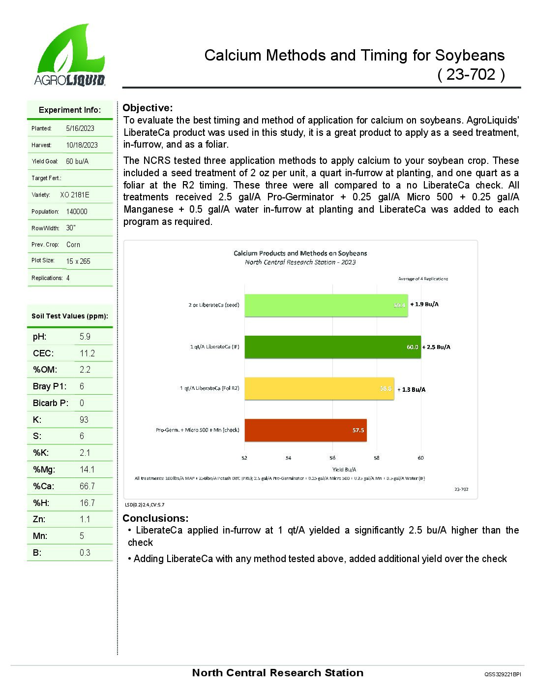 The objective of the trial was to evaluate soybean response to application rates and timings of LiberateCa.