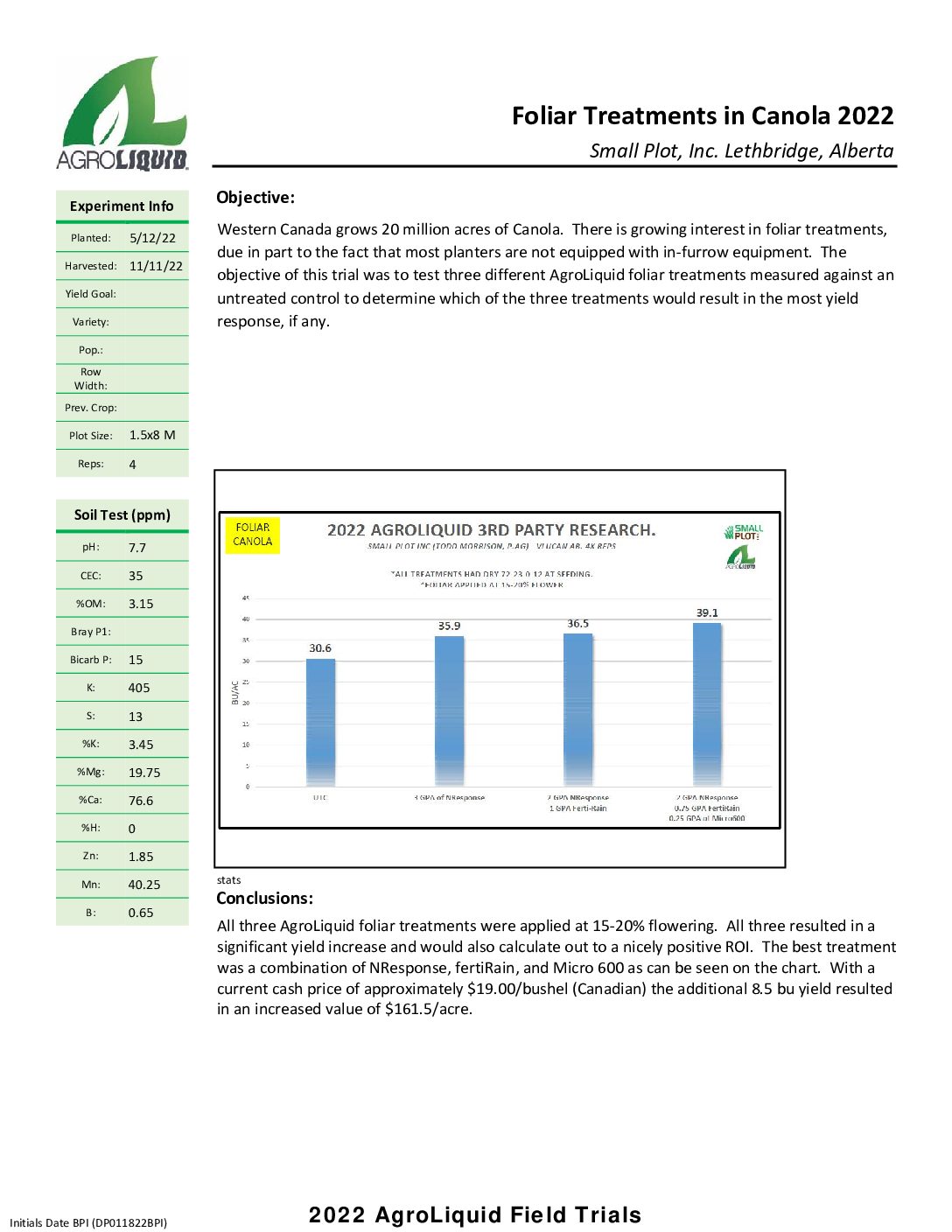 Crops: Canola. States / Provinces: Alberta. Nutrients: Multinutrient and Programs. Years: 2022. Applications: Foliar.