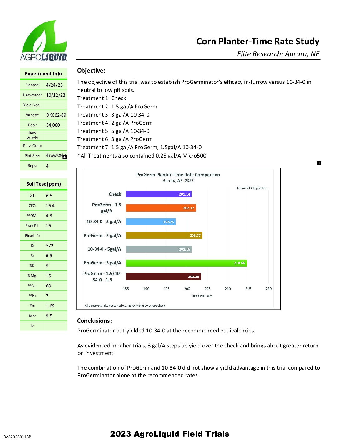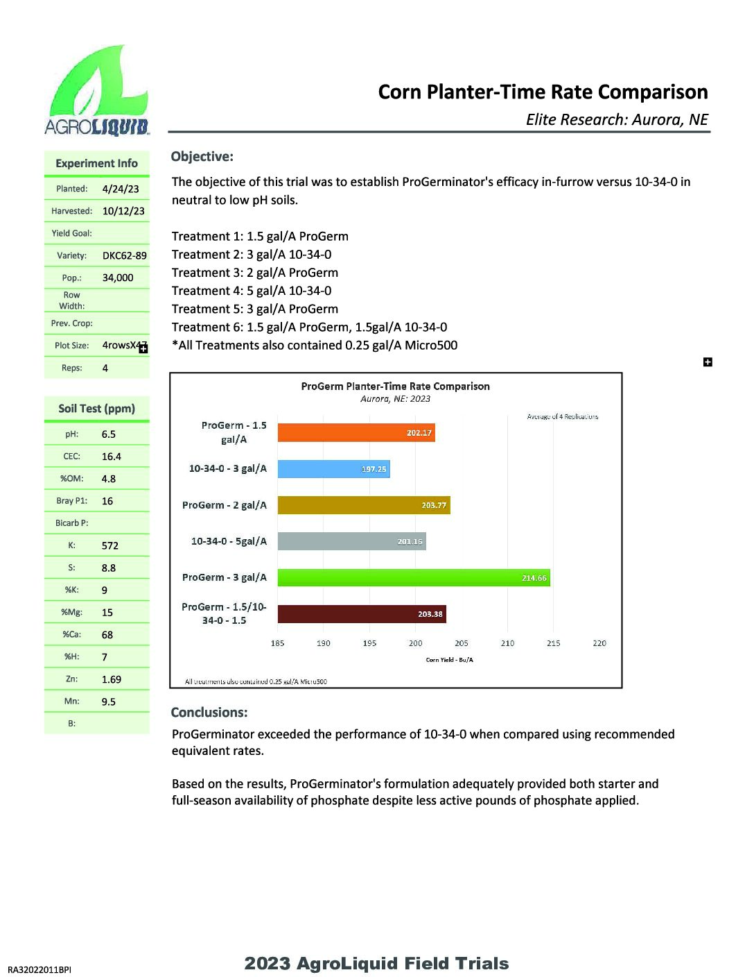 The objective of this trial was to establish ProGerminator’s efficacy in-furrow versus 10-34-0 in neutral to low pH soils.