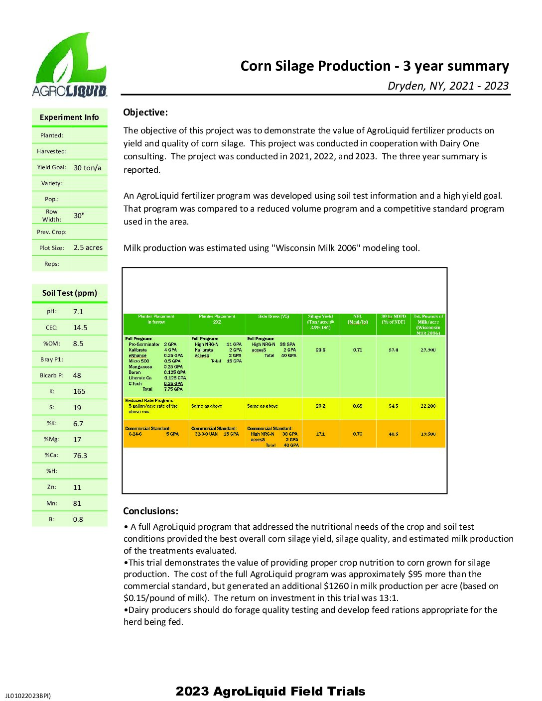 The objective of this project was to demonstrate the value of AgroLiquid fertilizer products on yield and quality of corn silage. This project was conducted in cooperation with Dairy One consulting. The project was conducted in 2021, 2022, and 2023. The three year summary is reported.