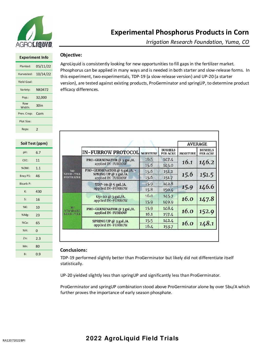 Crops: Corn. States / Provinces: Colorado. Nutrients: Phosphorus. Years: 2022. Applications: Planter and Strip-Till.
