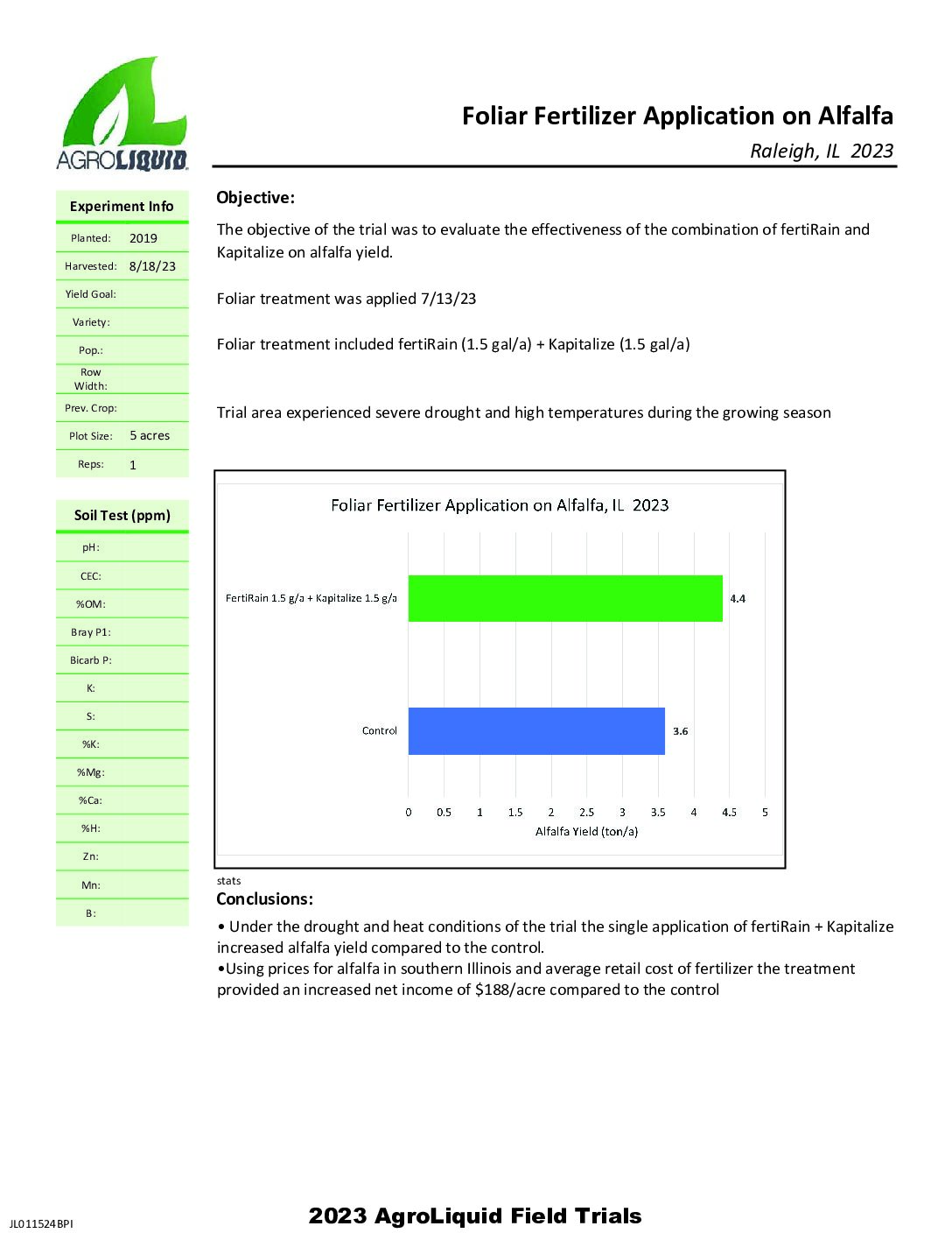 Crops: Alfalfa. States / Provinces: Illinois. Nutrients: Multinutrient, Potassium, Programs, and Sulfur. Years: 2023. Applications: Foliar.