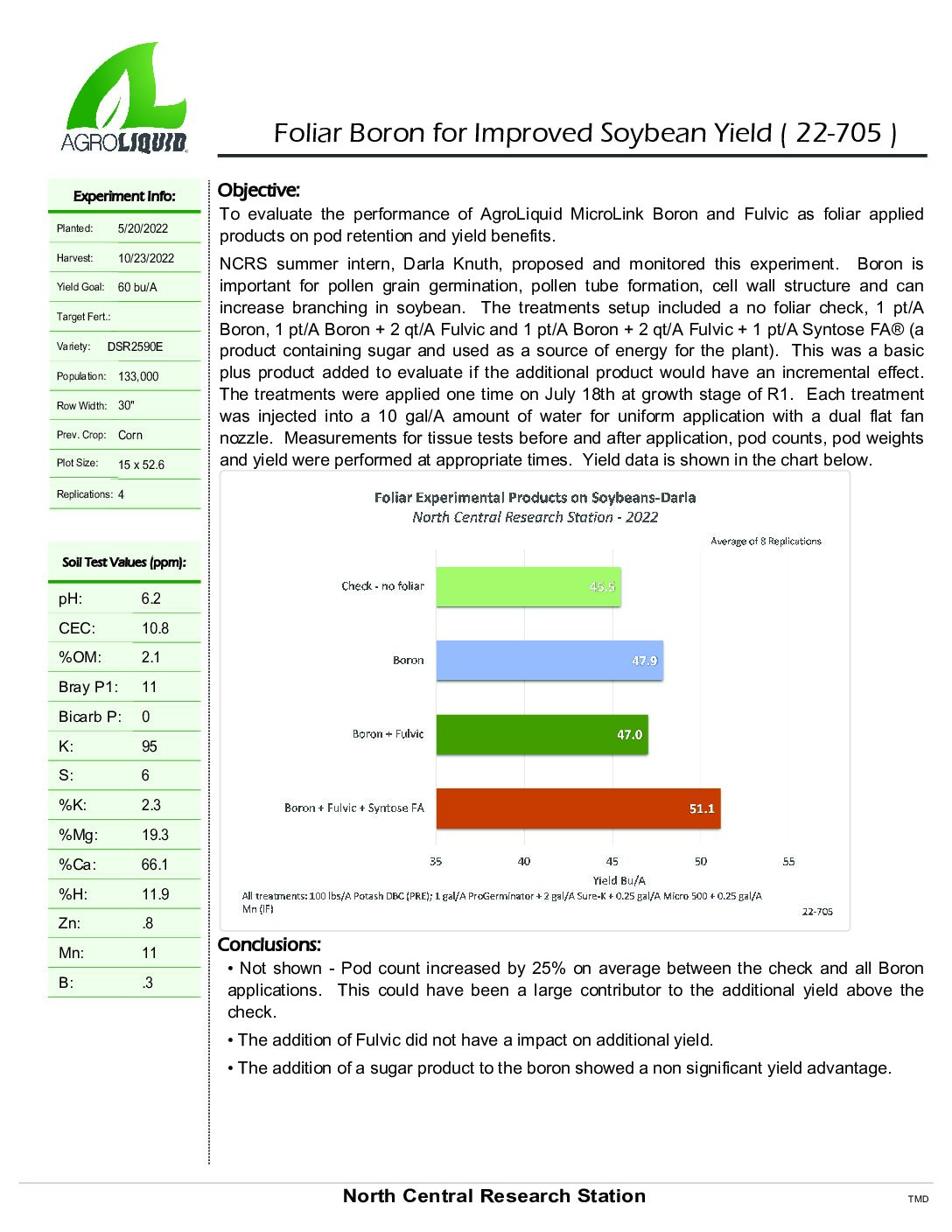 This trial is evaluating the performance of AgroLiquid MicroLink Boron and Fulvic as foliar applied products to determine any pod retention and yield benefits.