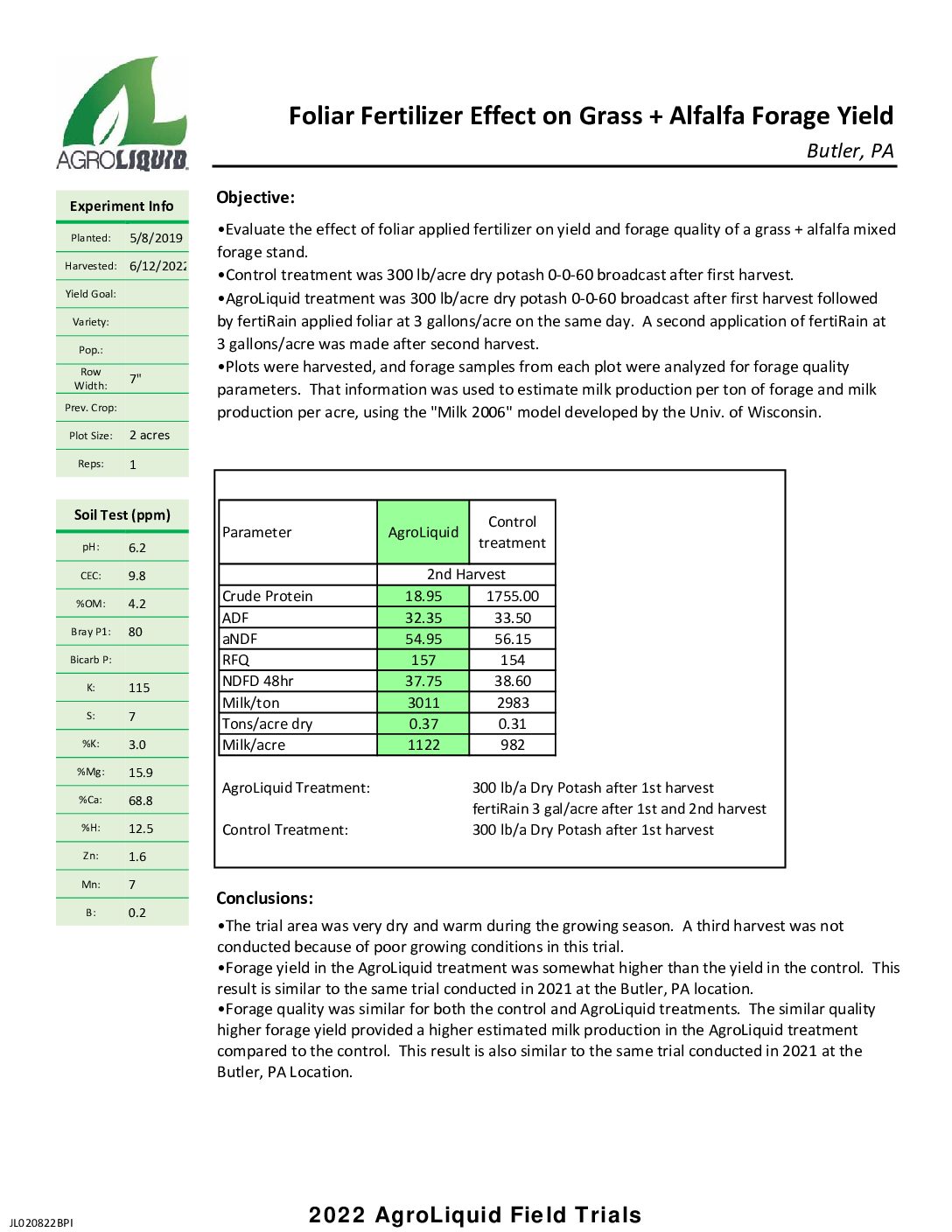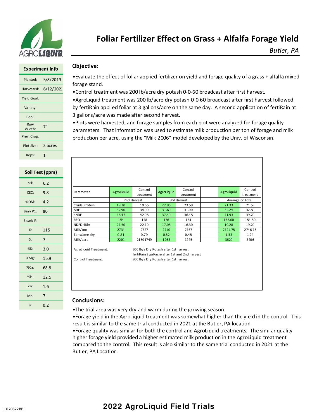 Crops: Grass forage. States / Provinces: Pennsylvania. Nutrients: Programs. Years: 2022. Applications: Foliar.