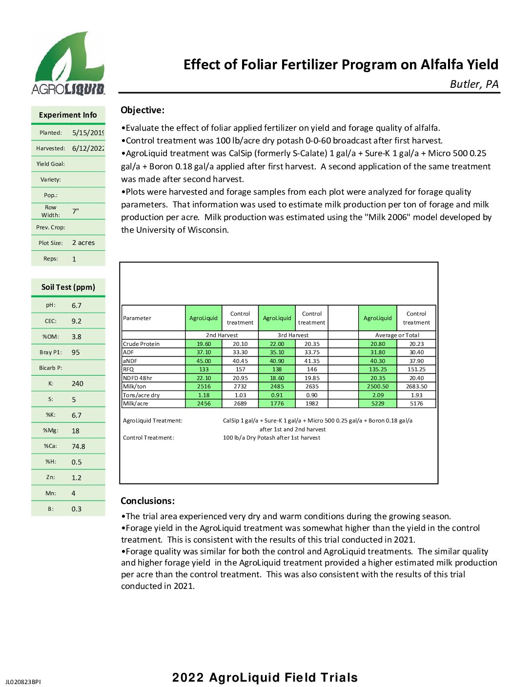 Crops: Alfalfa. States / Provinces: Pennsylvania. Nutrients: Multinutrient and Programs. Years: 2022. Applications: Foliar.