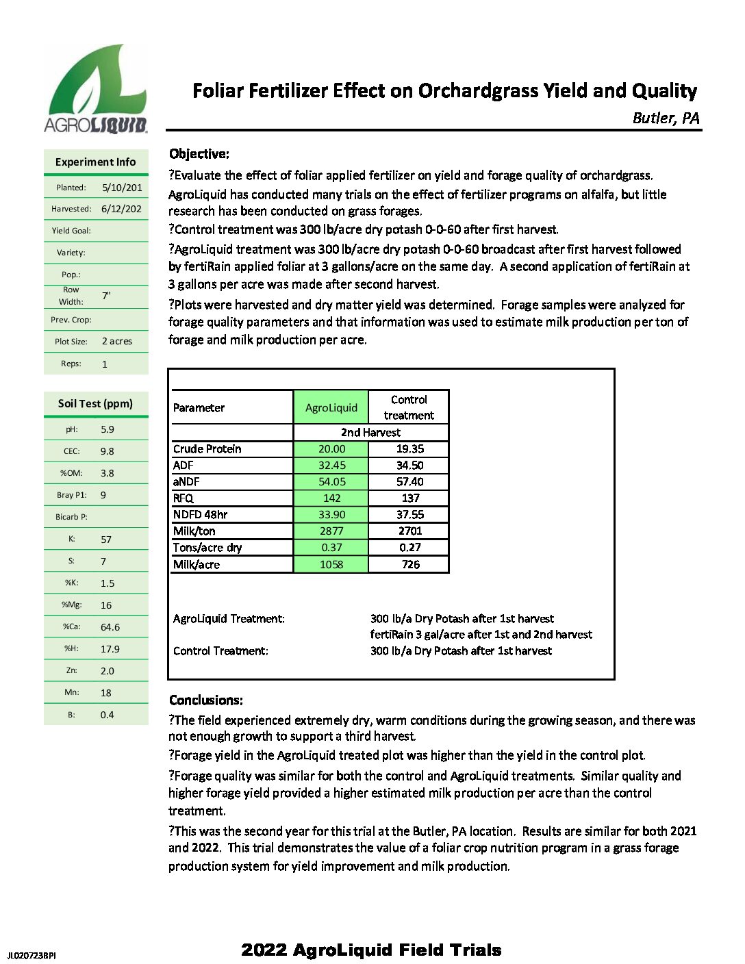 The objective of this trial was to evaluate the effect of foliar applied fertilizer on yield and forage quality of orchardgrass.