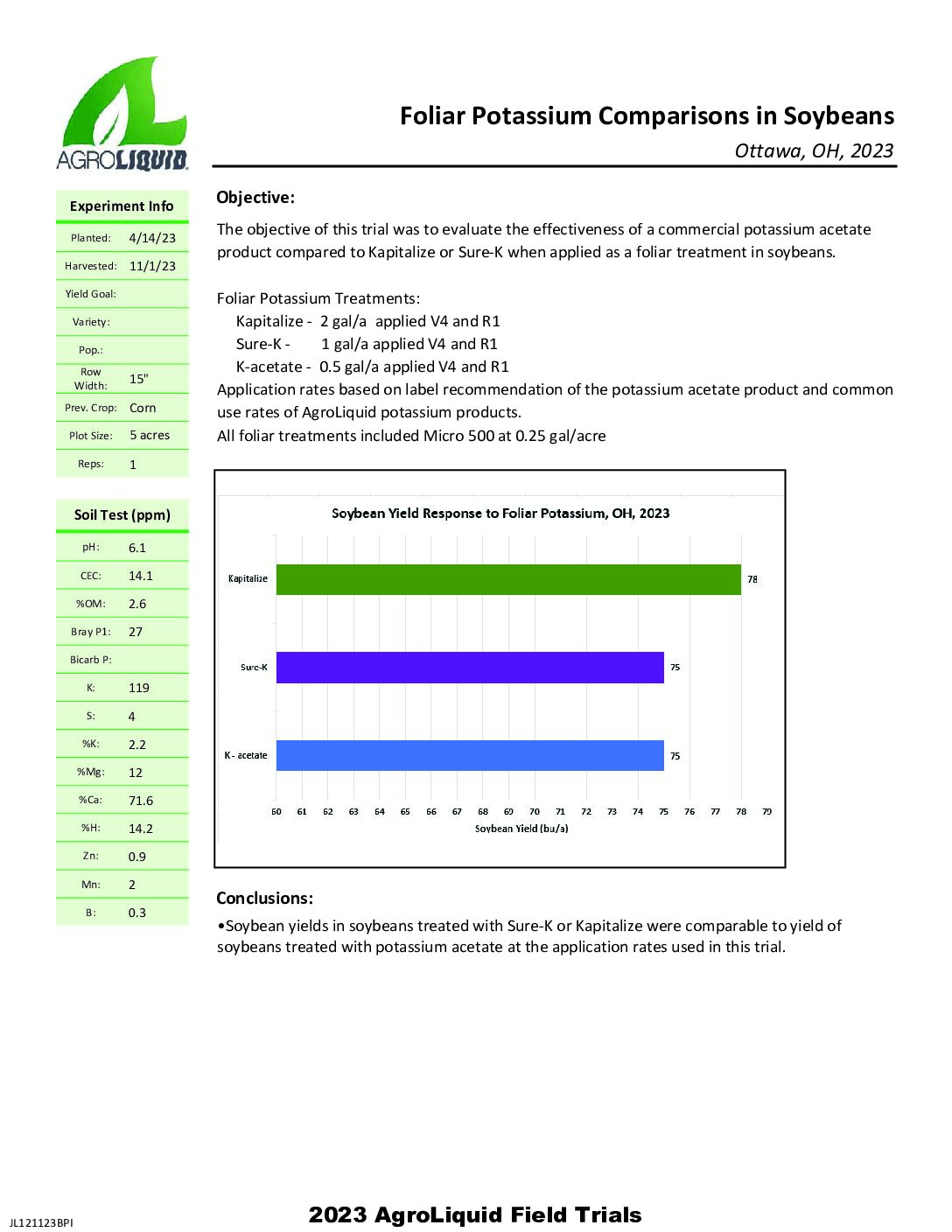 Crops: Soybean and Soybeans. States / Provinces: Ohio. Nutrients: Potassium. Years: 2023. Applications: Foliar.