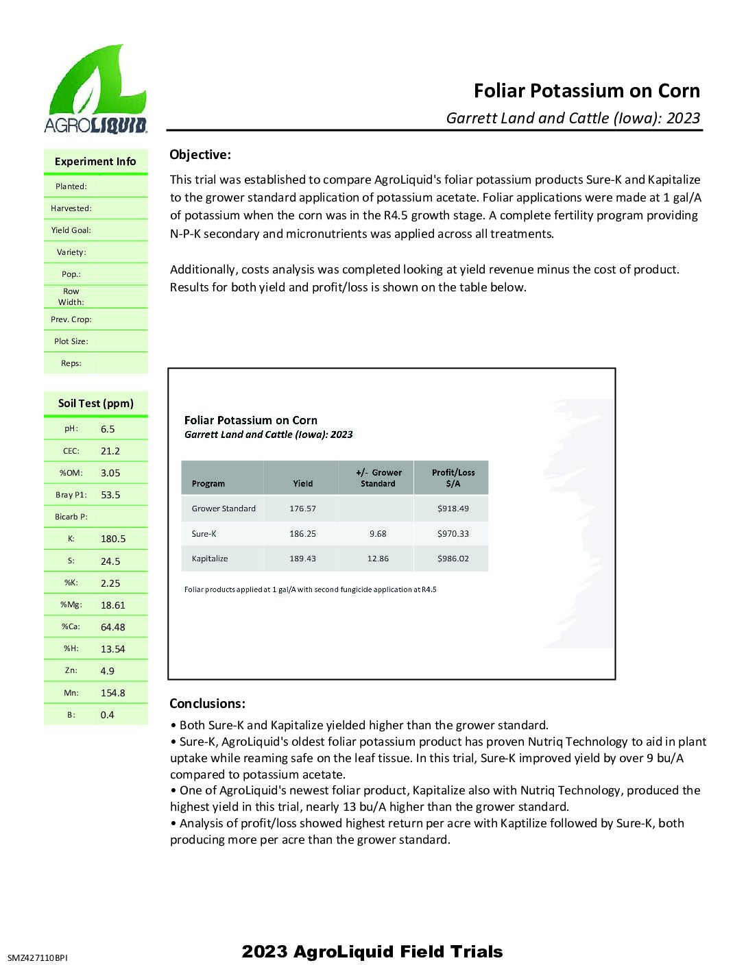 Crops: Corn. States / Provinces: Iowa. Nutrients: Potassium. Years: 2023. Applications: Foliar.
