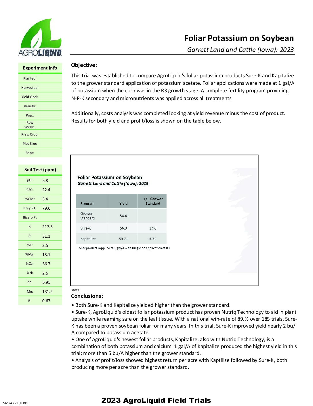 The objective of this trial was to evaluate the effectiveness of a commercial potassium acetate product compared to Kapitalize or Sure-K when applied as a foliar treatment in soybeans.