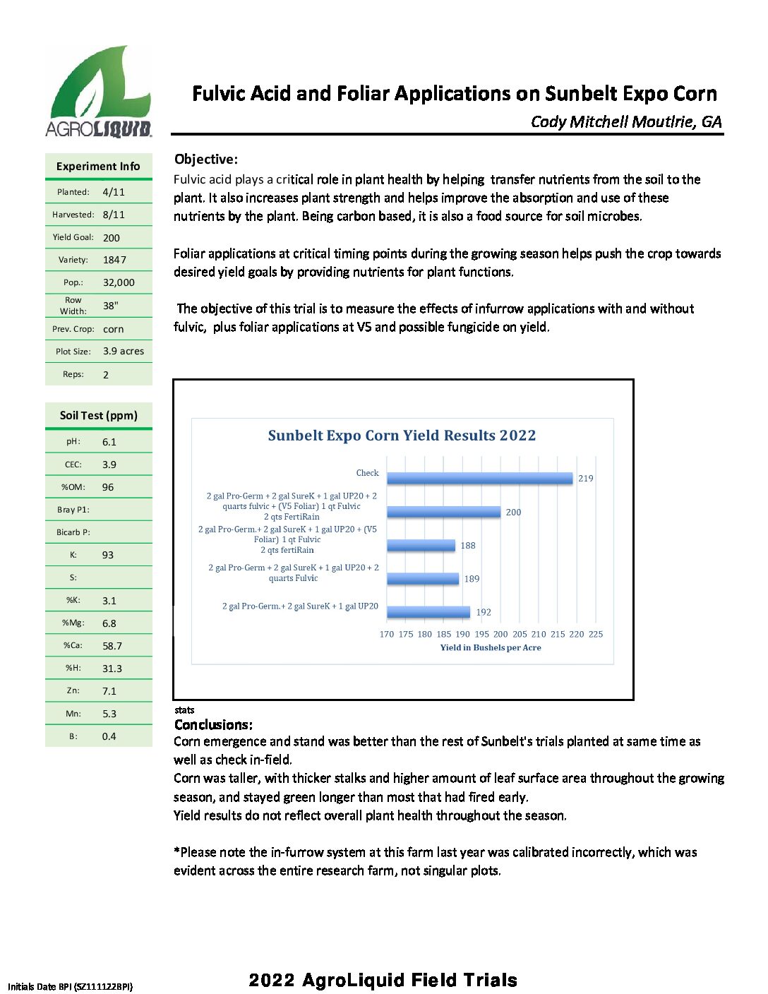Crops: Corn. States / Provinces: Georgia. Nutrients: Fulvic and Programs. Years: 2022. Applications: Foliar, Planter, and Planting.