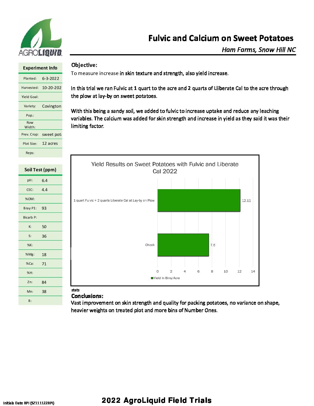 Crops: Sweet Potatoes. States / Provinces: North Carolina. Nutrients: Calcium and Fulvic. Years: 2022.