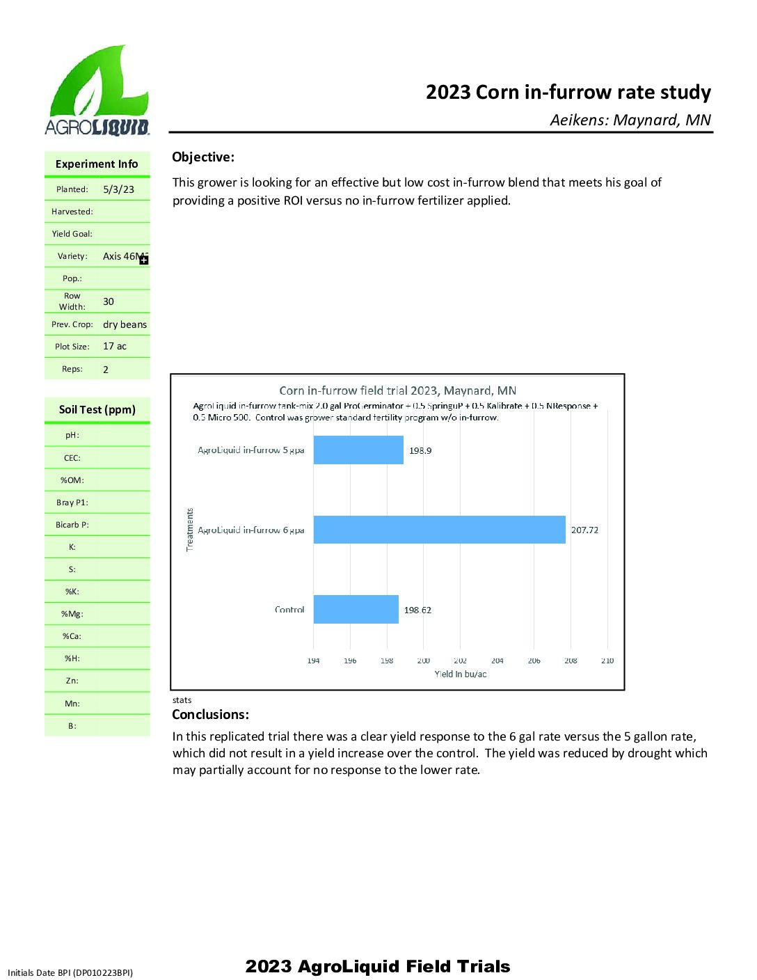 The objective of this trial is to compare the grower standard program against an AgroLiquid program to determine which program produces the highest yields by bin count.
