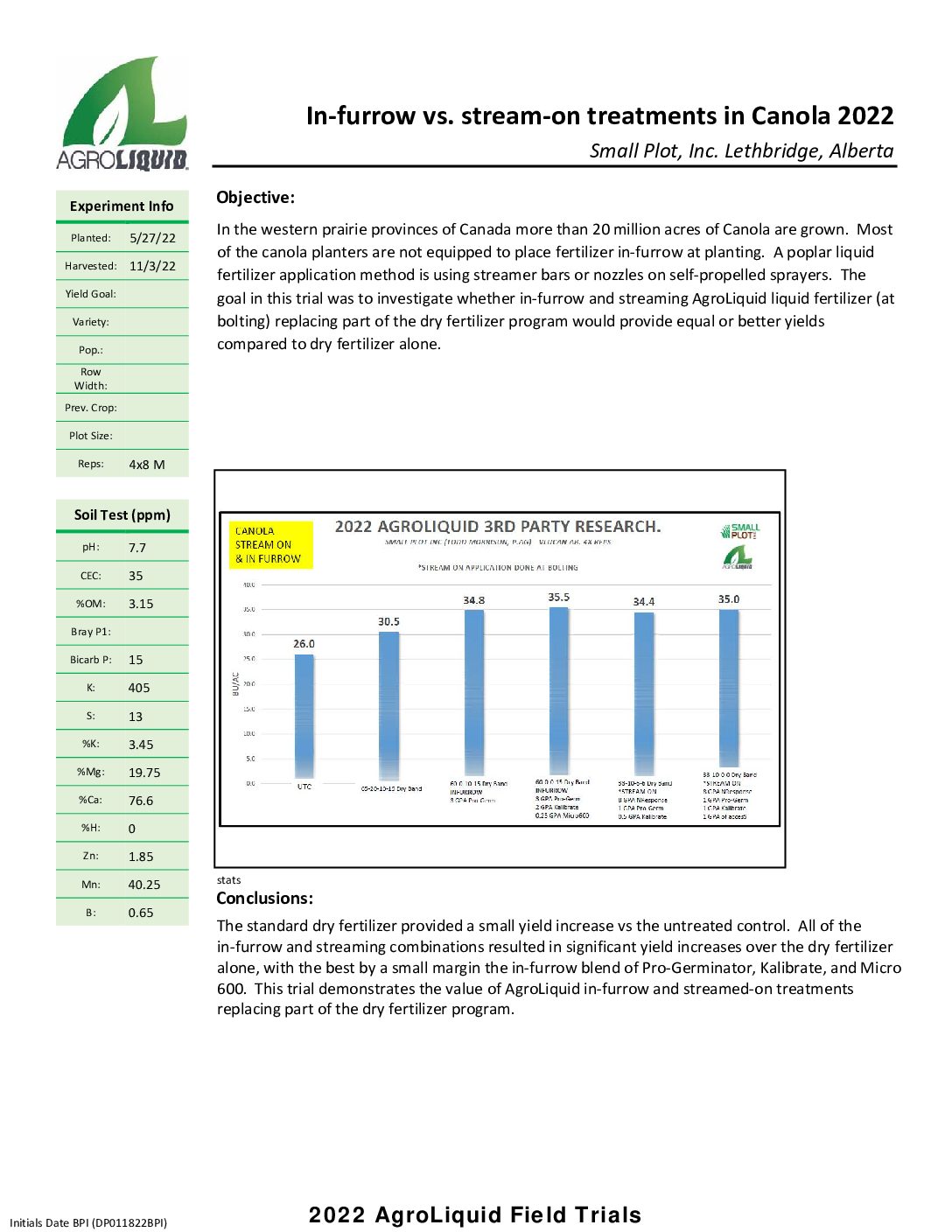 The goal in this trial was to investigate whether in-furrow and streaming AgroLiquid liquid fertilizer (at bolting) replacing part of the dry fertilizer program would provide equal or better yields compared to dry fertilizer alone.