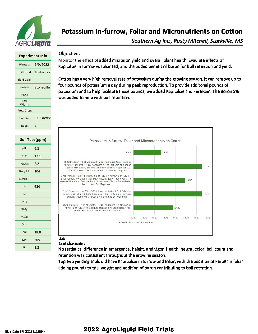 The objective of this trial was to monitor the effect of added micros on yield and overall plant health. The effects of Kapitalize in furrow vs foliar fed, and the added benefit of boron for boll retention and yield were also evalutaed.