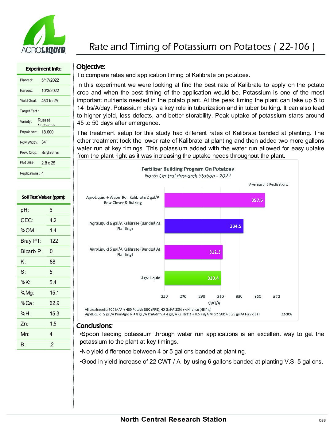 The sixth year of replicated research comparing AgroLiquid’s products for efficacy using PrG and Kalibrate, compared to the grower standard of 10-34-0, and Potassium Thiosulfate.