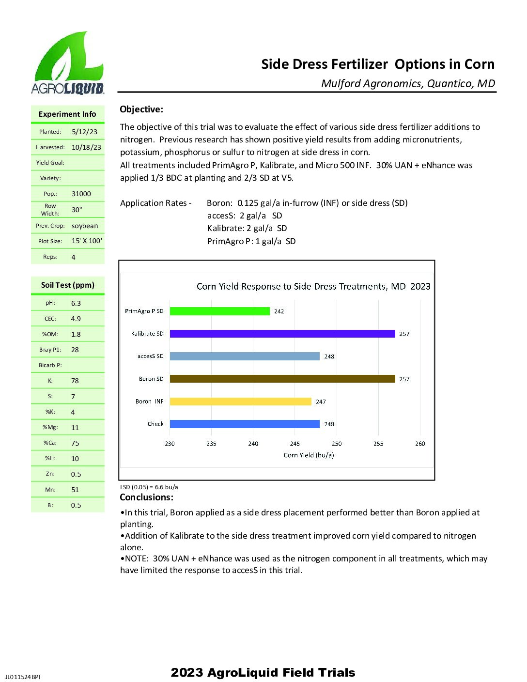 Crops: Corn. States / Provinces: Maryland. Nutrients: Micronutrients, Phosphorus, Potassium, Programs, and Sulfur. Years: 2023. Applications: Side Dress.