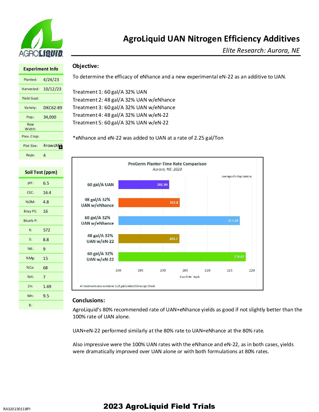 The objective of this trial is to determine the efficacy of AgroLiquid product eNhance and a new experimental eN-22 as an additive to UAN.
