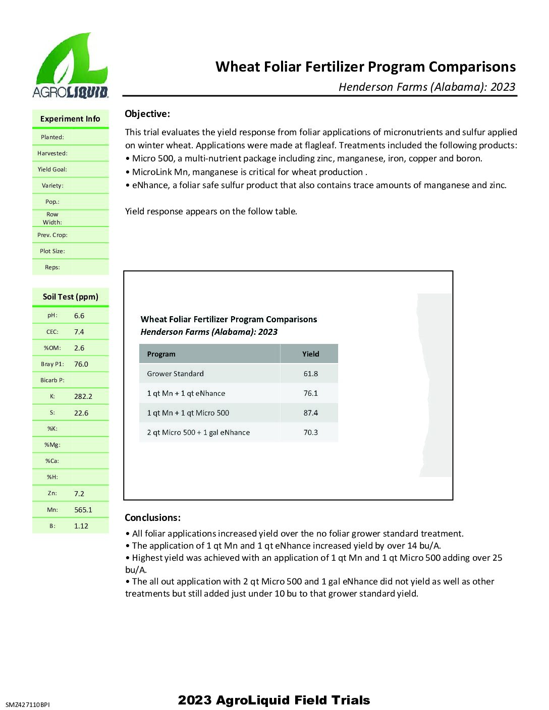 Crops: Wheat - Winter. States / Provinces: Alabama. Nutrients: Micronutrients, Multinutrient, and Sulfur. Years: 2023. Applications: Foliar.