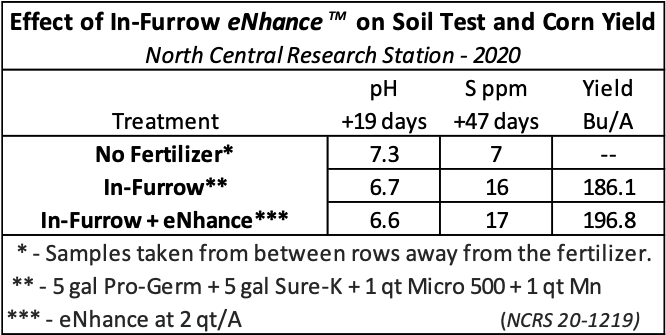 A replicated plot experiment was conducted in 2020 in a field with a higher pH and low soil test sulfur (as is common here and elsewhere). An in-furrow fertilizer program was applied both with and without a 2 qt/A rate of eNhance.