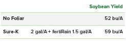 Sure-K and fertiRain can be applied alone, or in combination with each other or other crop nutrients. Soybeans will often require more potassium than fertiRain alone can provide, and fertiRain can provide additional nitrogen, phosphorus, and sulfur to Sure-K.