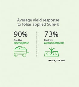 Sure-K was applied for 10 consecutive years in a corn-soybean rotation as a soil applied treatment and as a foliar treatment. Over the 10 years of the trial, the foliar application of Sure-K at 3 gal/A consistently performed as well as Sure-K applied at 5 gal/A in-furrow.